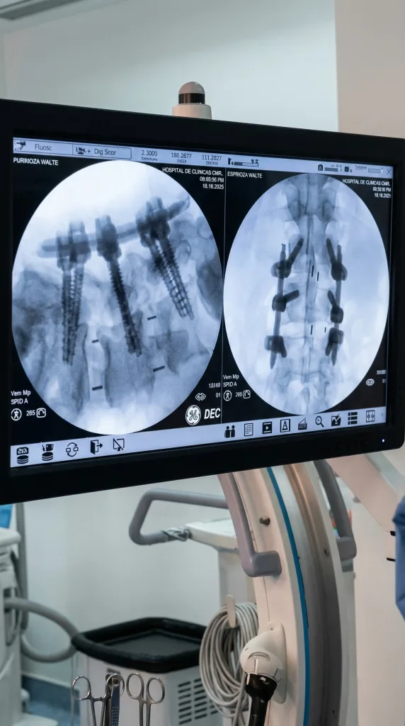 Una vez realizada la fusión en el espacio discal, el siguiente paso es estabilizar el segmento de la columna mediante la inserción de un tornillo a través de pequeñas incisiones cutáneas (fijación percutánea con tornillos pediculares).